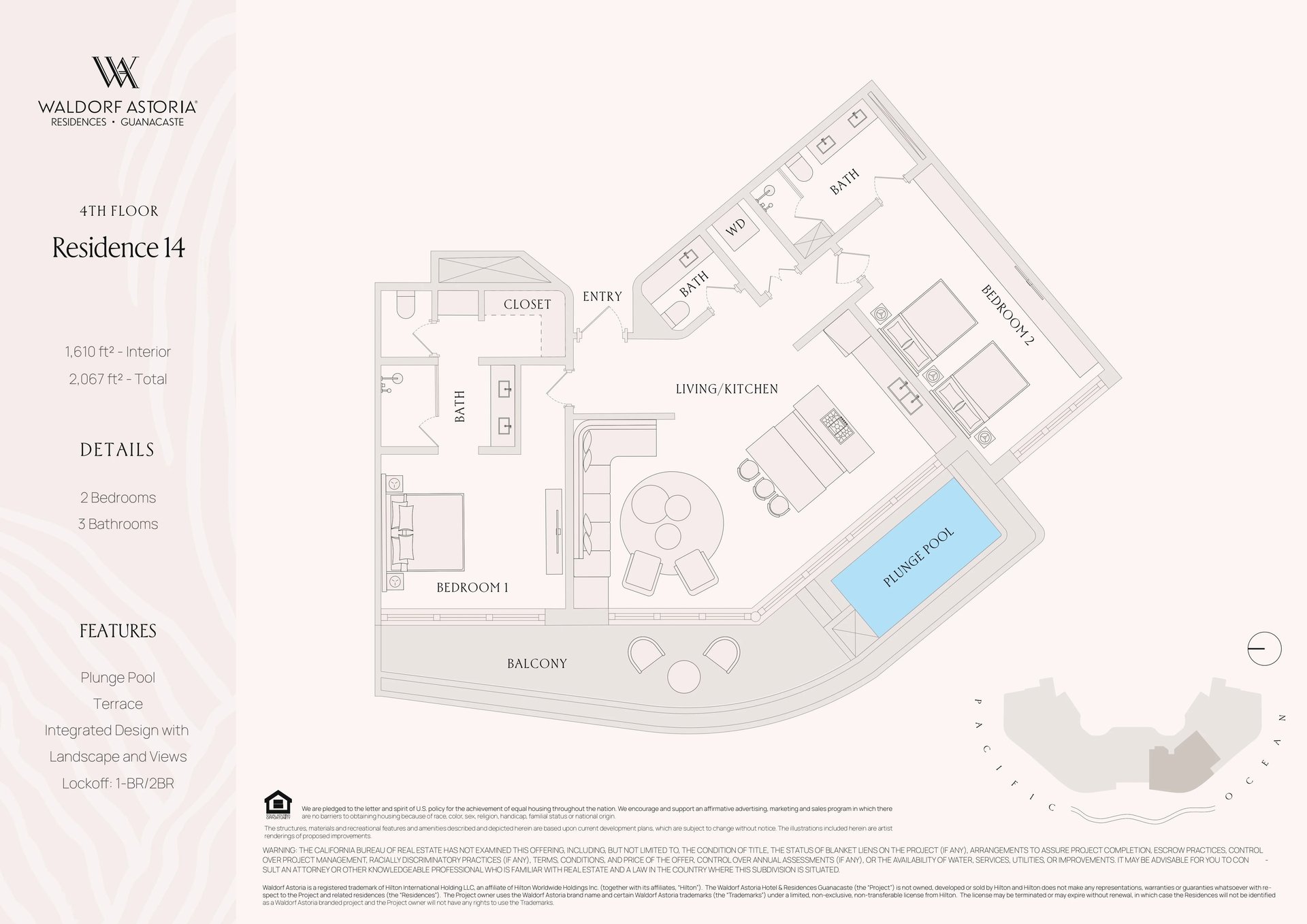 This brand-new, never-lived-in 2-bedroom, 3-bath residence offers 1,610 sq ft of interior living space, thoughtfully designed for seamless indoor-outdoor living. Floor-to-ceiling glass doors open to an additional 457 sq ft of covered outdoor terrace, complete with a private plunge pool, creating a tranquil extension of the living space and framing stunning ocean and lush landscape views.